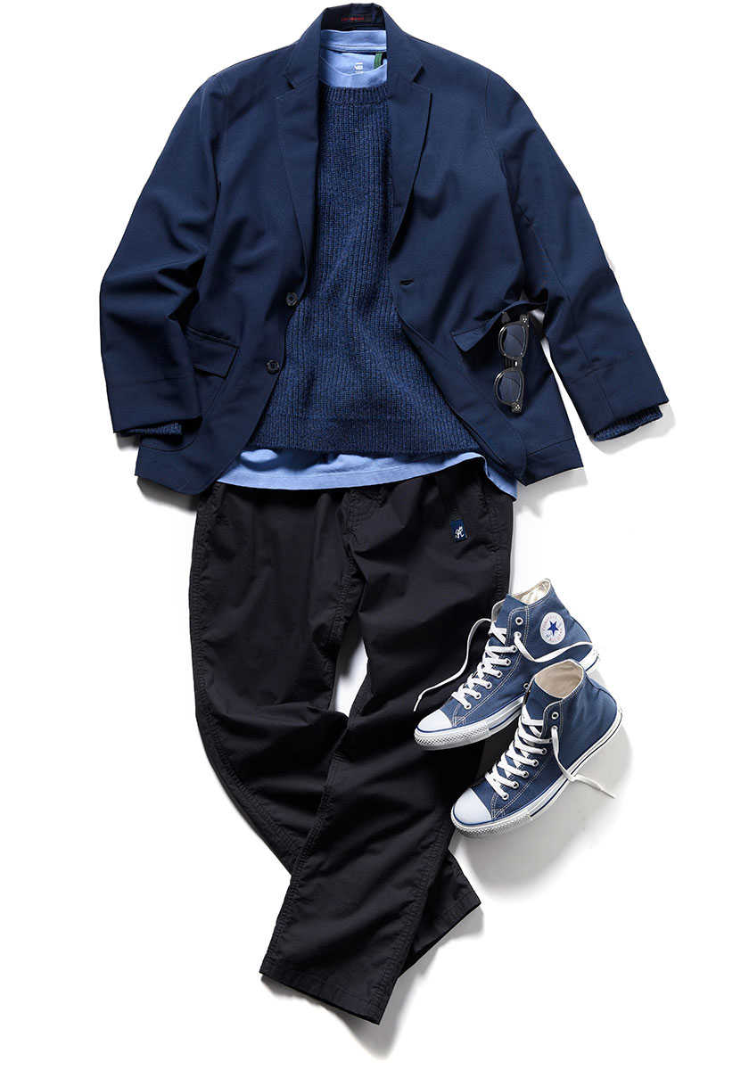 ジャケット6万円(ザ・ジジ/アマン)、サマーニット2万5000円(WP ウエストポイント/Safari Lounge)、Tシャツ6000円(ジースター ロゥ/ジースターインターナショナル)、ウェビングベルトパンツ1万9000円(グラミチ フォー RHC/RHC ロンハーマン)、スニーカー5800円(コンバース/コンバースインフォメーションセンター)、その他はスタイリスト私物