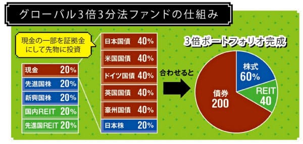 この投信は、国内と海外の株式・債券・REIT(不動産投資信託)に分散投資する投信だ。運用資金を100とすると、40を海外株、40を国内・海外のREITに投資する。そして、残り20の現金を証拠金として、日本株先物(20)、国内・海外の債券先物(200)に投資する。こうして100の運用資金に対し、「レバレッジ3倍」である300のポートフォリオが出来上がるわけだ。