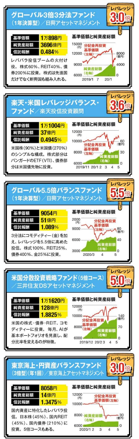 最近では、レババラ投信の種類も豊富になっている。短期的な値下がりリスクを許容できる人は、レバレッジを5倍程度まで高めた商品が有力だ。一方、できるだけ値下がりリスクを抑えたい人は、投資先を円資産に特化した商品や、相場に合わせてポートフォリオの配分比率を変更する商品が候補になる。前者は、「東京海上・円資産バランスファンド」(東京海上アセットマネジメント)、後者は「米国分散投資戦略ファンド」(三井住友DSアセットマネジメント)などが代表例だ。