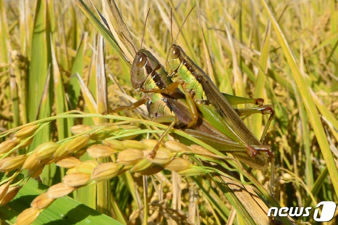 (포항=뉴스1) 최창호 기자 = 5일 오전 경북 포항시 북구 흥해읍 곡강리 들녘 나락 위에서 메뚜기 한쌍이 사랑을 나누고 있다. 2020.10.5/뉴스1