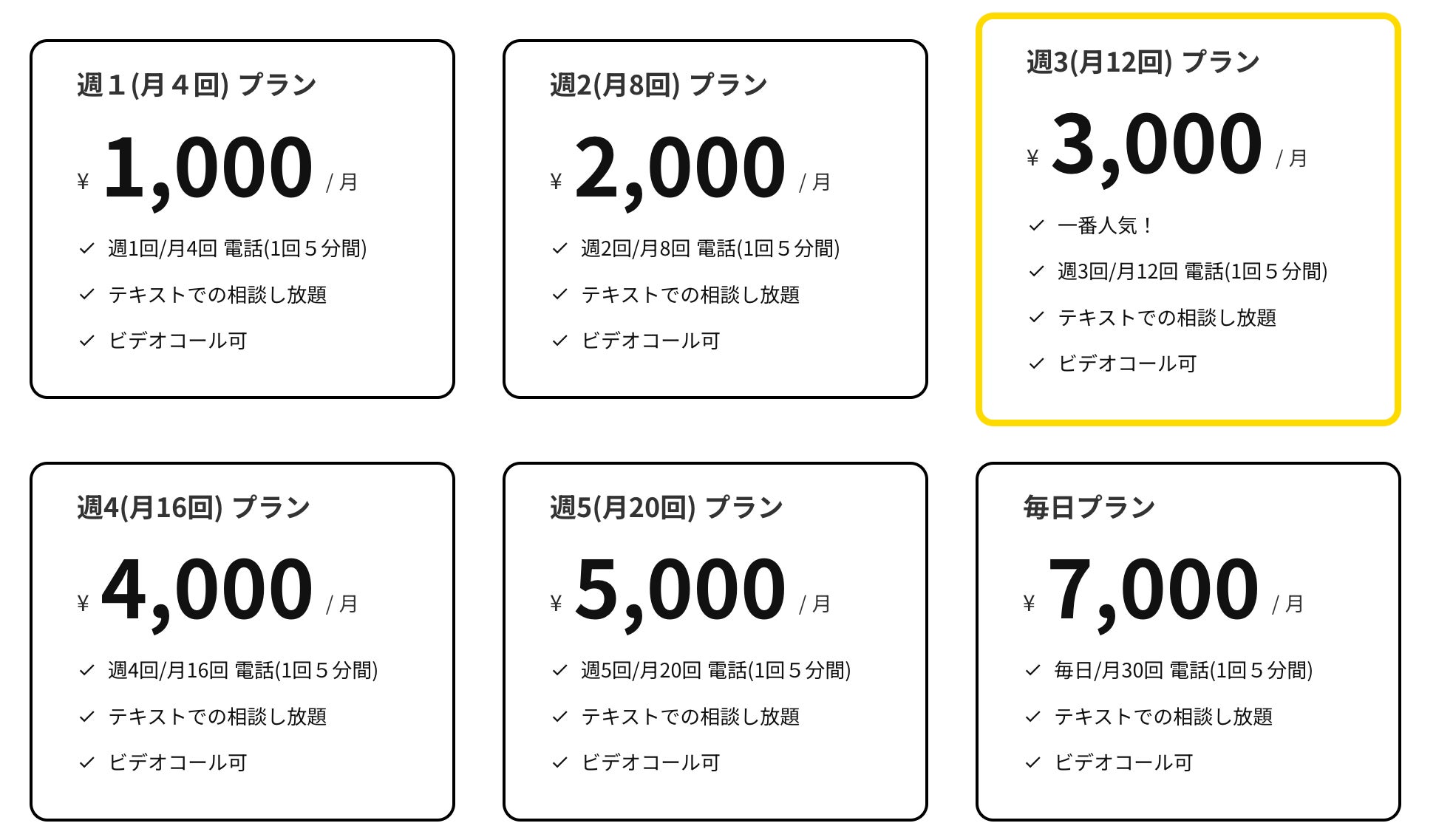 5分間の電話の頻度やコースを選択してください。週1回のプランから毎日のプランまで、自身の予算に合わせて1,000円単位で利用できます。また、10分コースも用意されています。